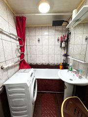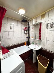 Стандартная кухня 5 кв. м., кухонный гарнитур останется. Санузел совмещенный, отделан плиткой, все коммуникации поменяны.