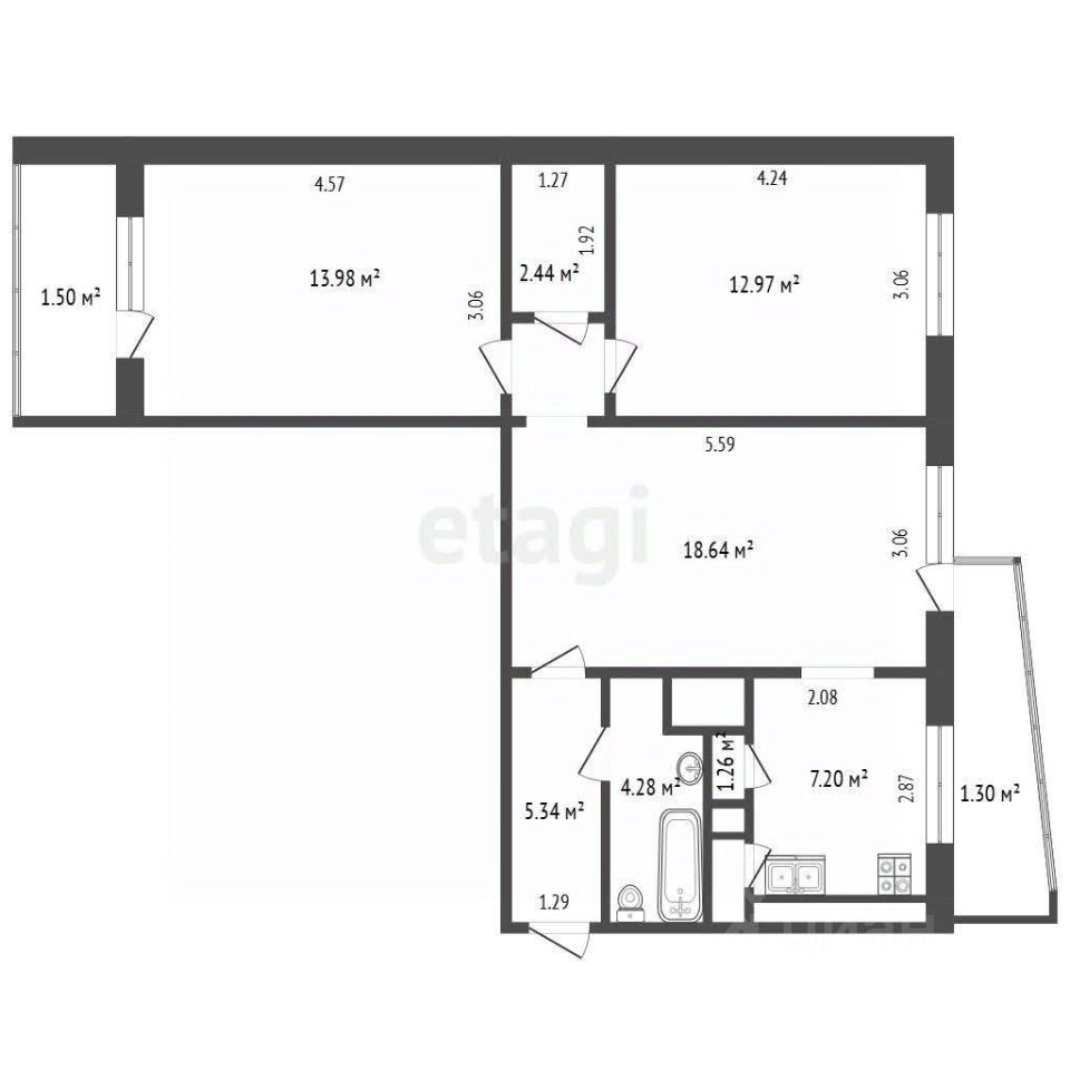 Две изолированные комнаты, зал проходной. Сделана перепланировка квартиры. Кухня 7,2 м.кв. и ванная увеличены. Санузел совмещен.