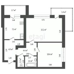Общая площадь 46 кв.м. включает две изолированные комнаты площадью 10,4 и 15,2 кв.м. Планировка функциональная: из одной комнаты есть выход на застекленный балкон 10 м, а кухня площадью 7,2 кв.м. ведет на просторную лоджию. Окна выходят на разные стороны, что обеспечивает хорошее проветривание, а так же отличный вид из окна. Межкомнатные перегородки в квартире выполнены из красного кирпича, что дает хорошую шумоизоляцию.