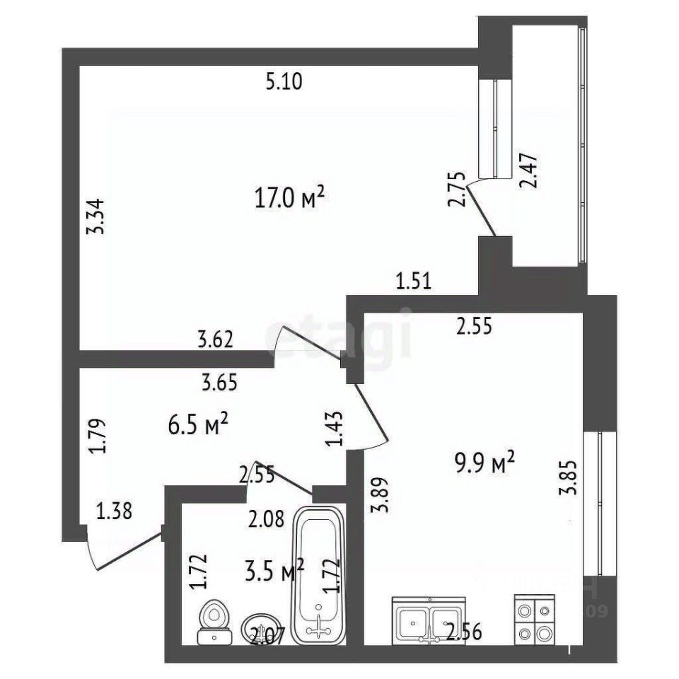 Квартира не угловая, с балконом, общей площадью 35,3 кв. м. с большой кухней — 10,2 кв. м., спальня — 16,2 кв. м.