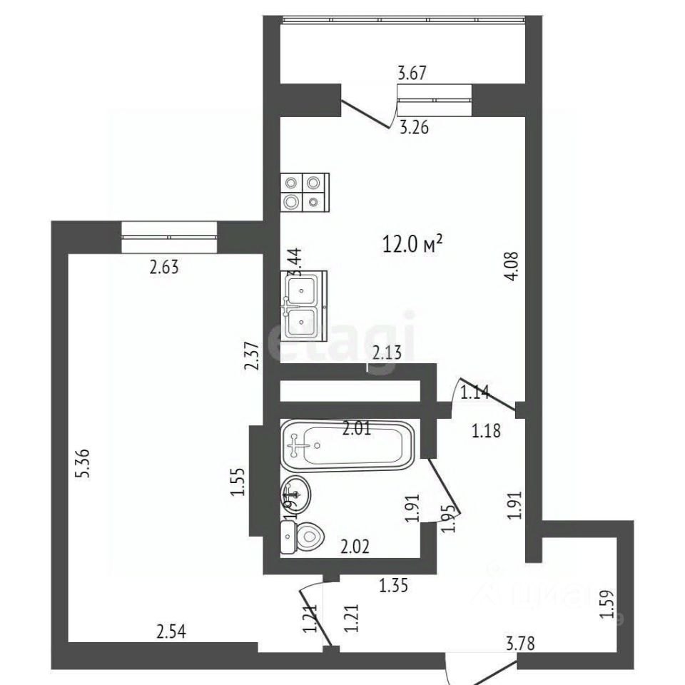 Квартира отличается рациональной планировкой с изолированной кухней в 12 кв. м и большой верандой-балконом, которая может служить дополнительной зоной для отдыха.