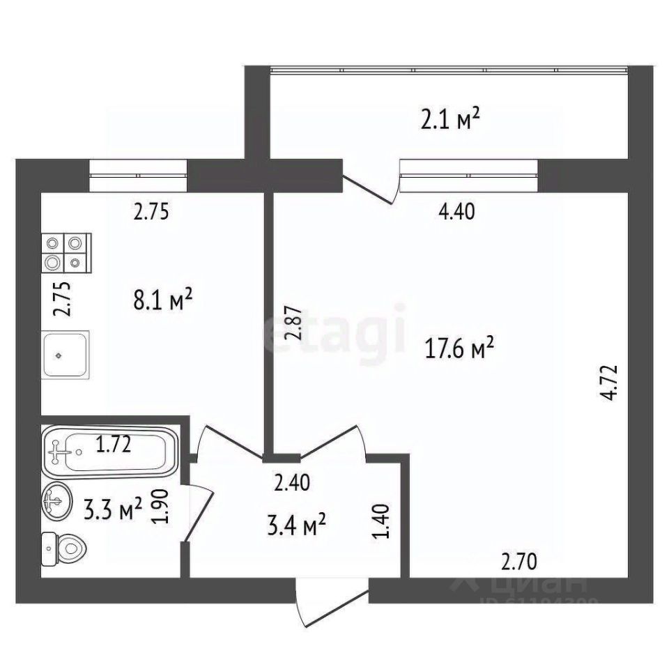 Квартира не угловая. Общая площадь без учета балкона составляет 32,4 кв. м. Комната 17,6 кв. м, кухня 8,1 кв. м.