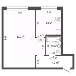 Этаж высокий. Квартира не угловая. Отопление центральное. Окна выходят на юго-восток. Без балкона. Общая площадь 31,9 кв.м. Просторная комната — 19 кв.м. Кухня 5,9 кв.м. Санузел совмещенный.