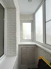 Балкон обшит декоративной плиткой, проведено электричество.