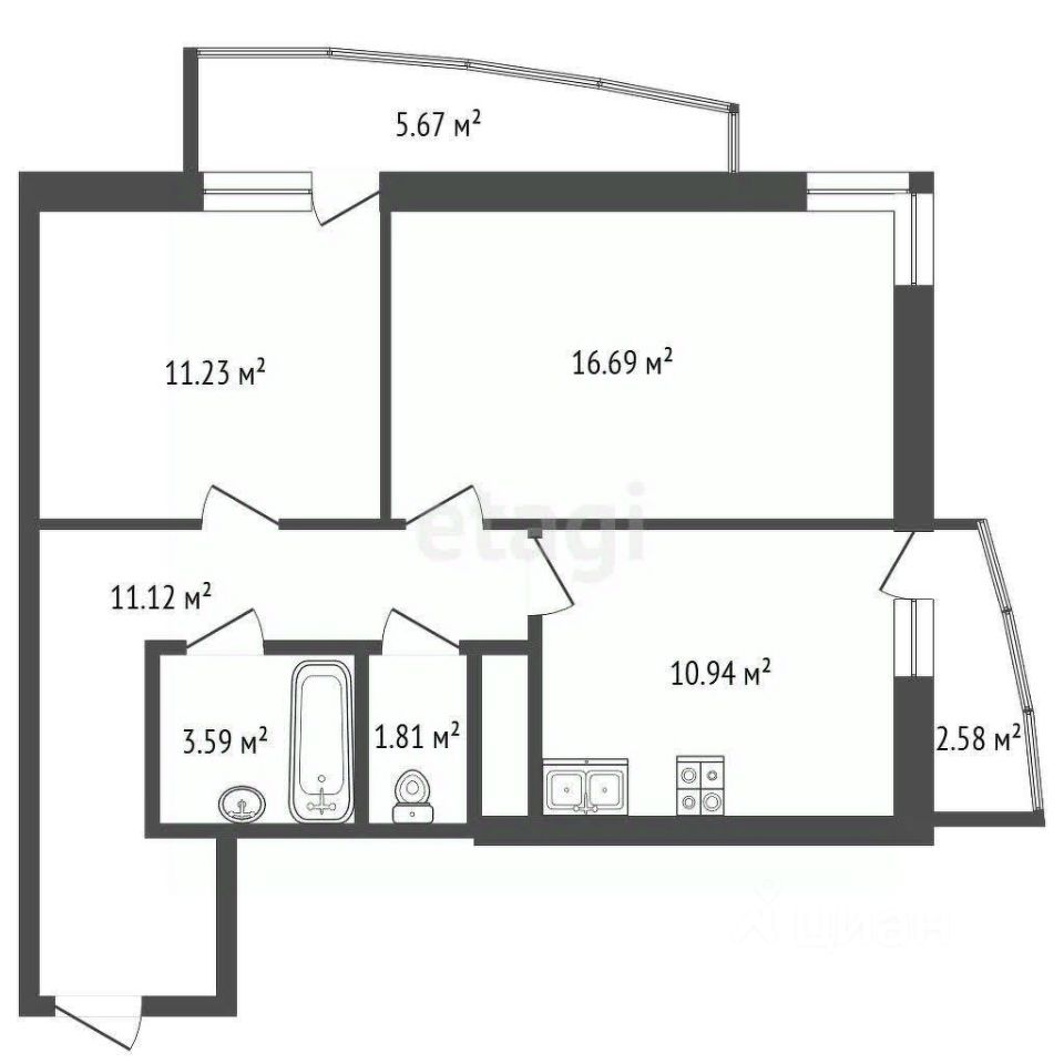 Планировка отличается практичностью: просторная кухня площадью 10,94 кв. м с выходом на балкон и две изолированные комнаты 16,69 кв. м и 11,23 кв. м с выходом на другой большой балкон площадью 5,67 кв. м.