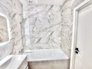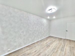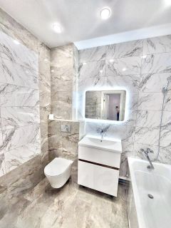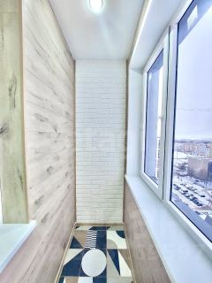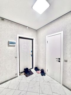 В квартире сделан современный качественный ремонт. Выровнены стены, пол. Окна пластиковые. Лоджия застеклена пластиковой рамой. Новая входная металлическая дверь. Установлены новые современные межкомнатные двери. Современные радиаторы отопления. Новая электрика, трубы, сантехника. Потолки натяжные с встроенными точечными светильниками. Напольное покрытие: холл и кухня — плитка керамогранит, гостиная — ламинат 33 класса. Санузел совмещен, отделан плиткой, сделан теплый пол (новая сантехника, акриловая ванна, удобная тумба). Установлены счетчики г/х воды.