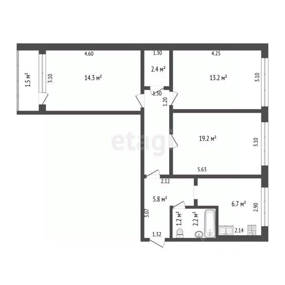 Объект расположен на высоком первом этаже, что обеспечивает удобный доступ и максимум естественного света. Планировка практичная и рациональная: изолированные комнаты 13,2 и 14,3 кв. м, кухня 6,7 кв. м, совмещенный санузел, застекленная лоджия и функциональная гардеробная площадью 2,4 кв. м.