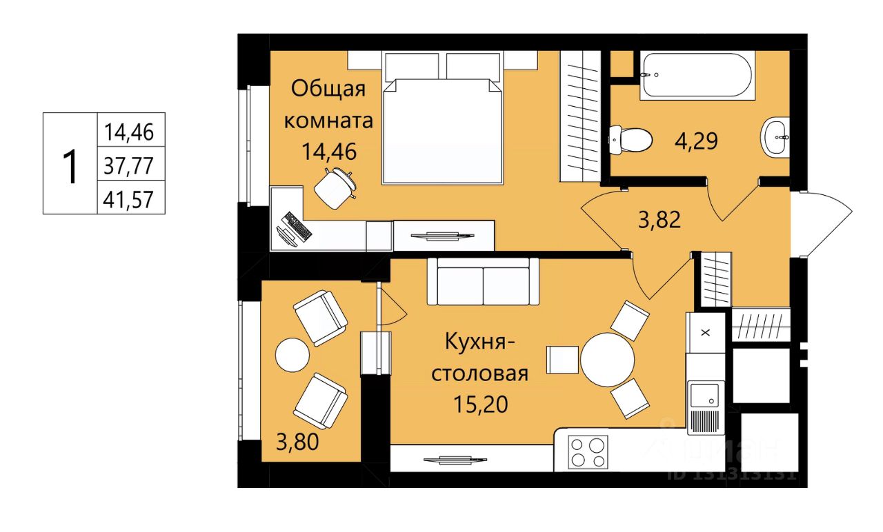 Общая площадь37,77 м²