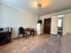 В комнате пластиковое окно, натяжной потолок. Напольное покрытие - линолеум. С продажей останется вся мебель и техника: шкаф, диван, стол, холодильник, микроволновая печь, индукционная плитка.