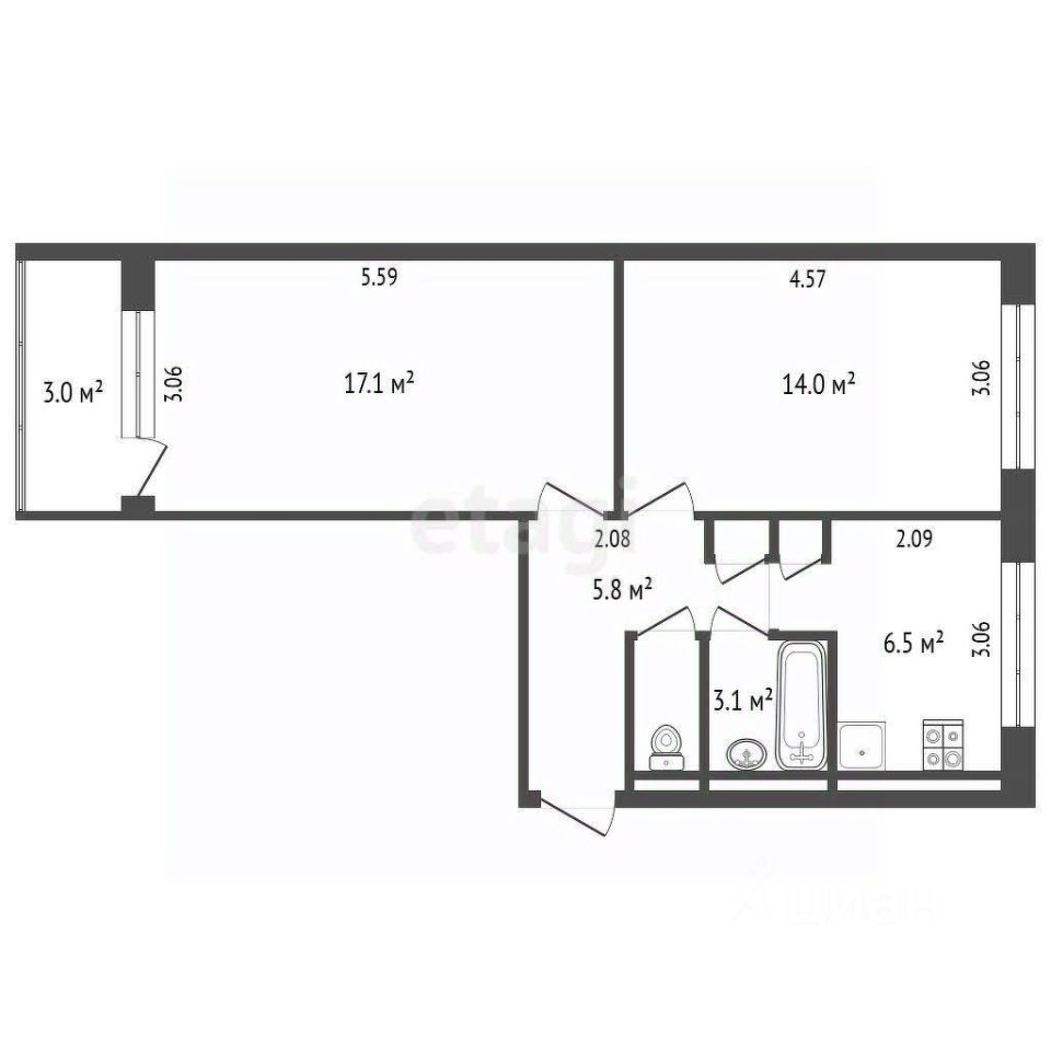 Этаж высокий. 3 квартиры на лестничной площадке. Отопление центральное. Окна квартиры на обе стороны дома (северо-восток и юго-запад). Общая площадь — 47,2 кв. м. Комнаты изолированные 14 и 17,1 кв. м. Кухня 6,5 кв. м. Есть лоджия с выходом из комнаты.