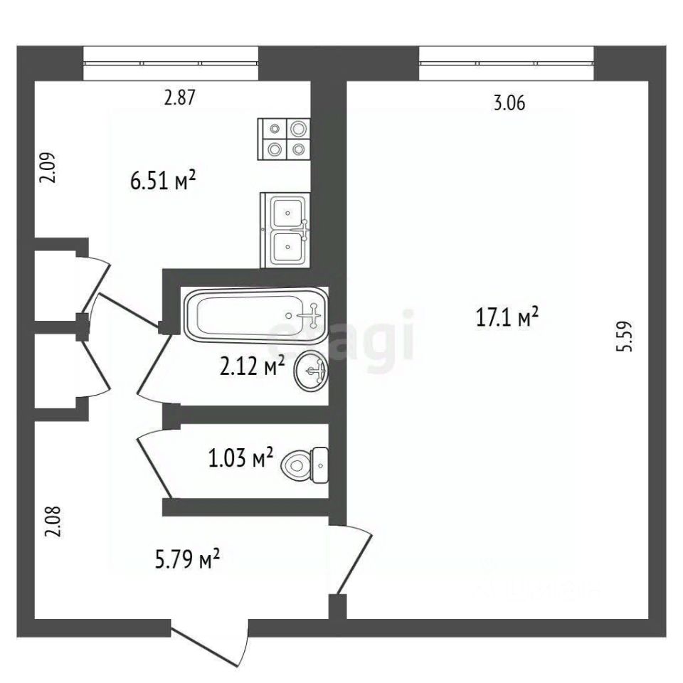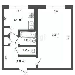 Зал — 17,1 кв. м, кухня — 6,51 кв. м, прихожая — 5,79 кв. м, ванная — 2,12 кв. м, туалет — 1,03 кв. м.