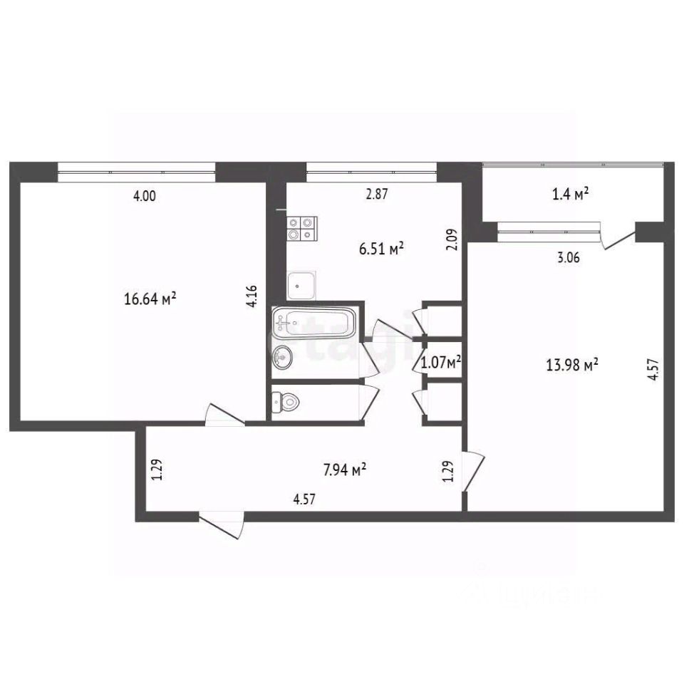 Общая площадь 49,3 кв. м. Комнаты просторные, 16,6 и 14 кв. м, и, что немаловажно, изолированные.