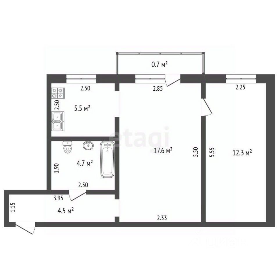 Ключевым преимуществом является кухня-гостинная, которая образует просторную светлую зону для комфортного отдыха и приема гостей. Из гостинной есть выход на балкон, что создает дополнительное пространство для хранения вещей или организации зоны отдыха. Вторая комната полностью изолирована, обустроена под спальню.