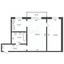 Продается просторная 2-комнатная квартира площадью 42,9 кв. м на 4 этаже 5-этажного кирпичного дома.