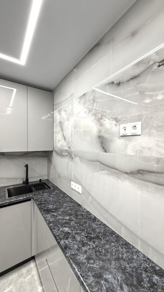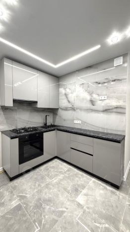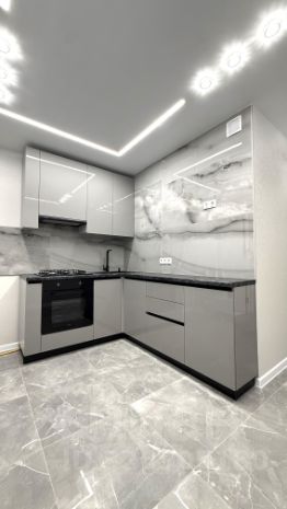 Продается уютная квартира с современным евро ремонтом. Просторная кухня площадью 10 мг оформлена в стильных серых тонах с акцентом на мраморную плитку и встроенной техникой. Из окон открывается вид на солнечную сторону, наполняя помещение естественным светом.
