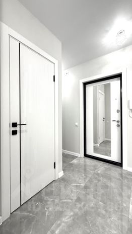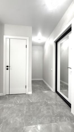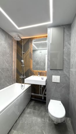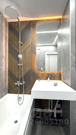 Натяжные потолки со встроенными светильниками, люстры, световые линии, современные межкомнатные двери, входная дверь с зеркалом, в ванной крупноформатный керамогранит, акриловая ванна, тропический душ, раковина под стиральную машину, инсталляция, электрический полотенцесушитель. В кухне установлен кухонный гарнитур с варочной поверхностью и электрическим духовым шкафом, на стене крупноформатный керамогранит. Выход на лоджию из кухни.