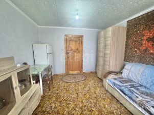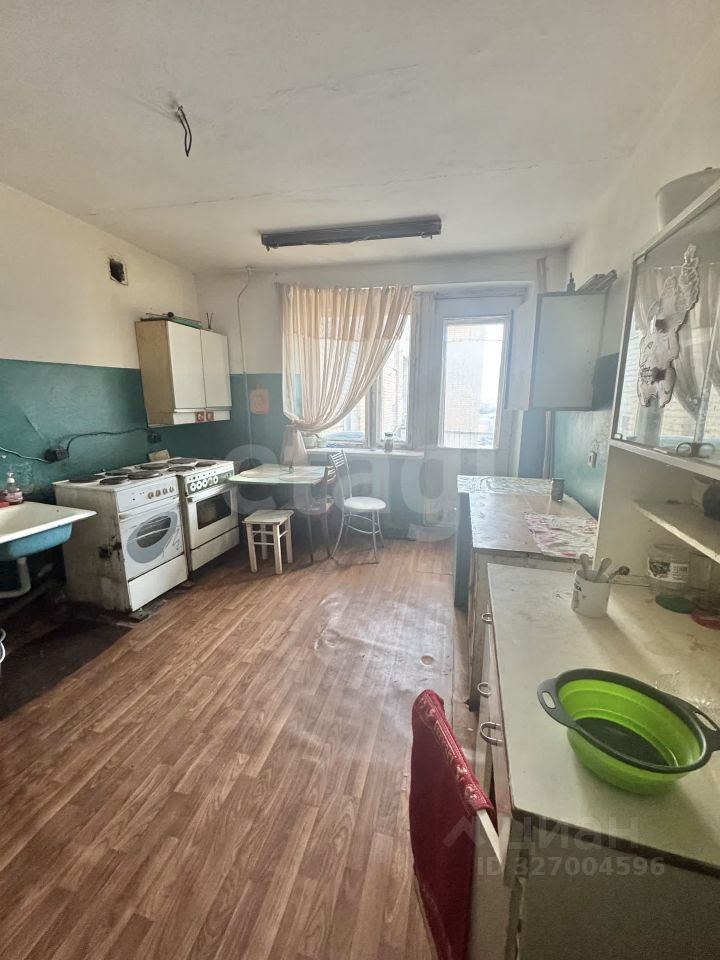 Комната расположена на 8-м этаже 9-этажного кирпичного дома. Отопление центральное. Не угловая, установлены чугунные батареи. Секция на 8 комнат. 2 душа, 2 туалета, кухня в секции. В комнате деревянные окно и дверь. Напольное покрытие — линолеум.