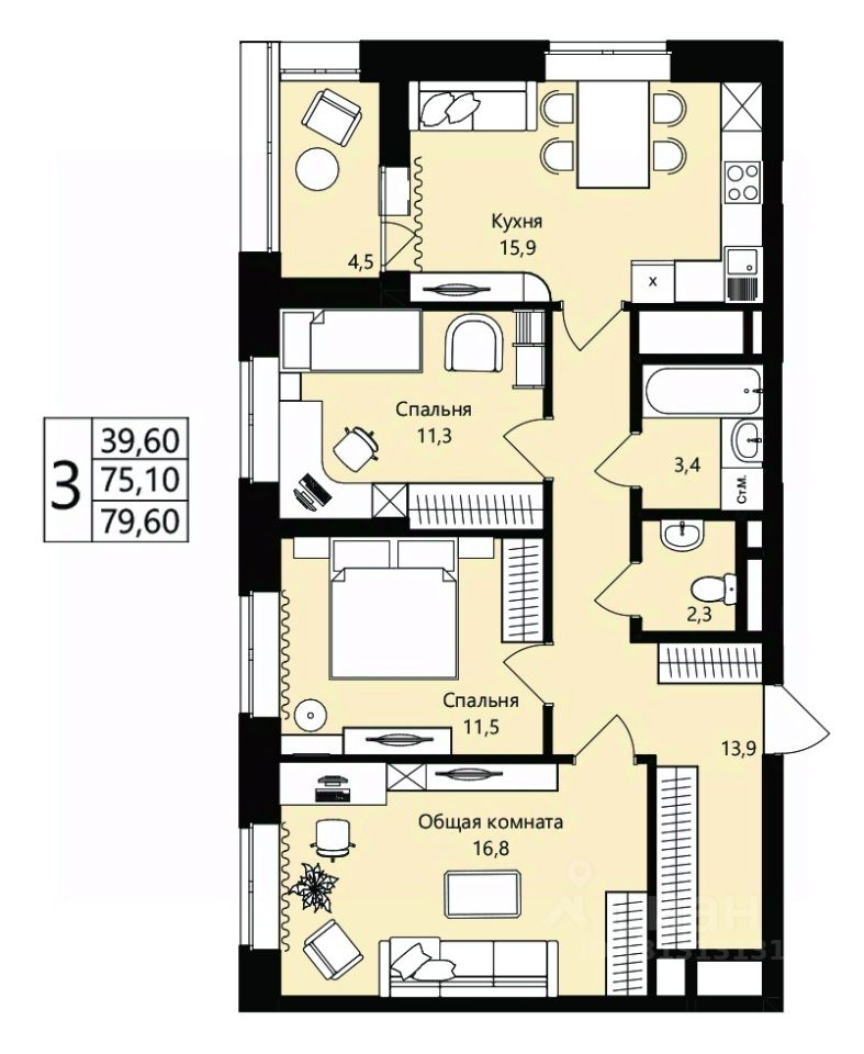 Общая площадь75,1 м²