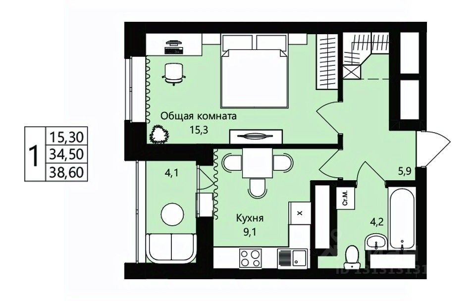 Общая площадь34,5 м²