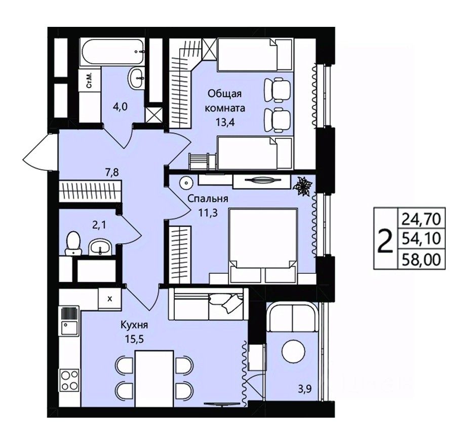 Общая площадь54,1 м²