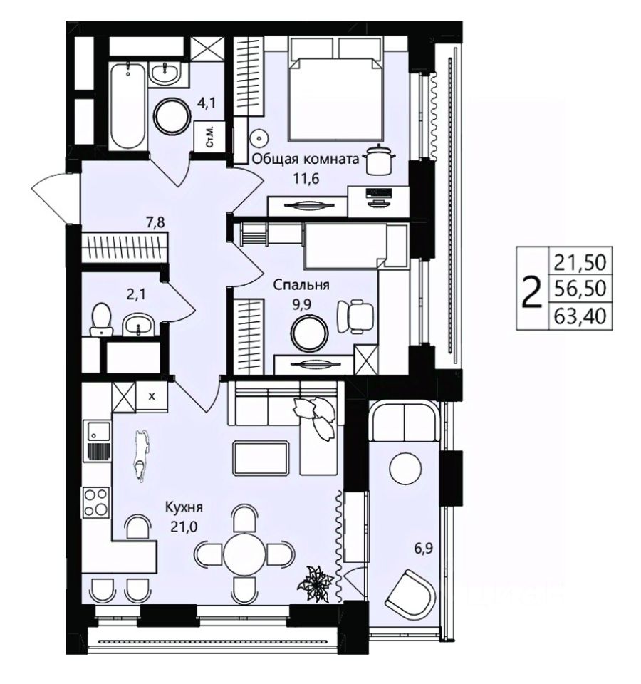 Общая площадь56,5 м²