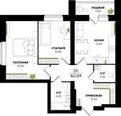 1 комнатные квартиры - от 39,6 кв. м. до 44,8 кв. м.2 комнатные квартиры - от 55,4 кв. м. до 62,4 кв. м.3 комнатные квартиры - 71,44 кв. м.