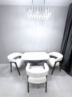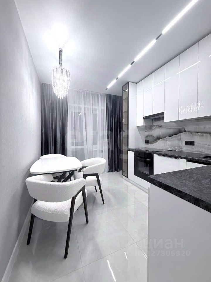 Кухонный гарнитур укомплектован встроенной техникой — варочной панелью, духовым шкафом и вытяжкой, посудомоечной машиной, а также дополнен витриной с подсветкой. Практичным решением стала гардеробная зона в прихожей. Межкомнатные двери с металлической кромкой и магнитными замками. Раздвижной стол, удобные современные стулья.