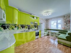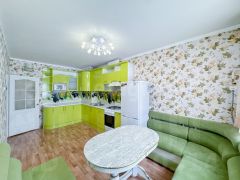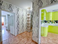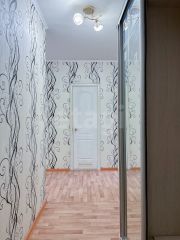 Металлическая входная дверь. Окна — деревянные стеклопакеты, лоджии остеклены пластиковым стеклопакетом и облагорожены деревянной вагонкой. Потолки побелены. Напольное покрытие — линолеум. Ванная комната в кафеле, туалет отделан пластиковыми панелями. Установлены счетчики на г/х воду и газ. С продажей в квартире останется кухонный гарнитур.