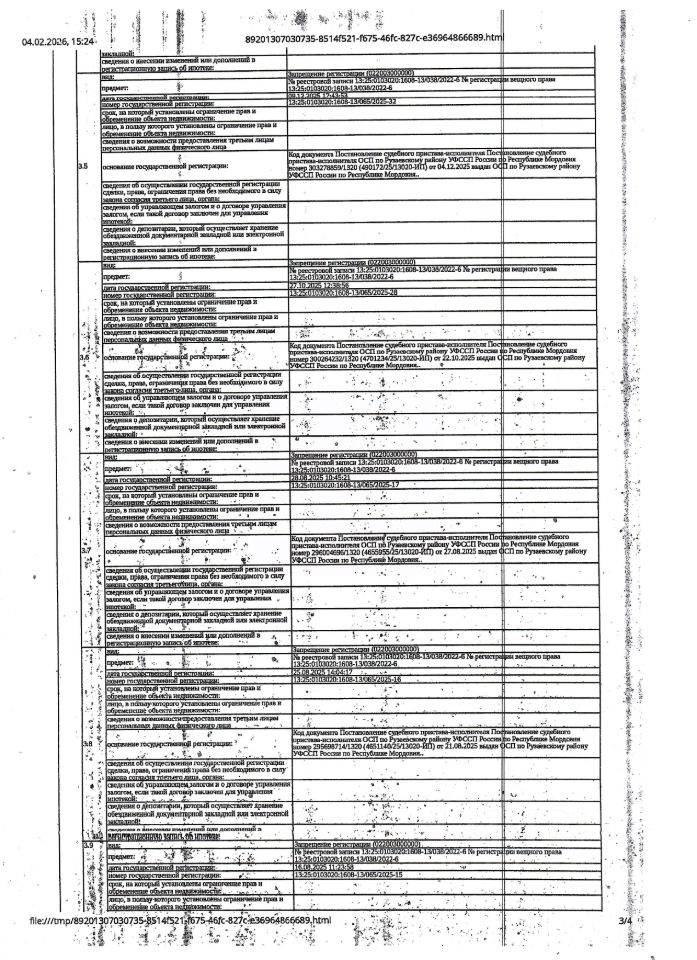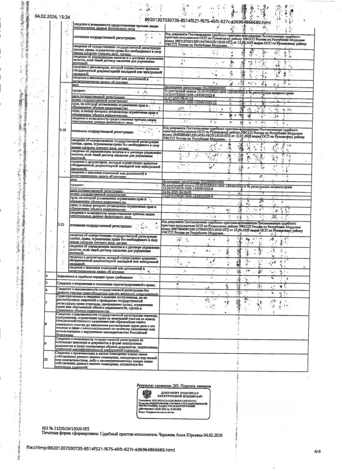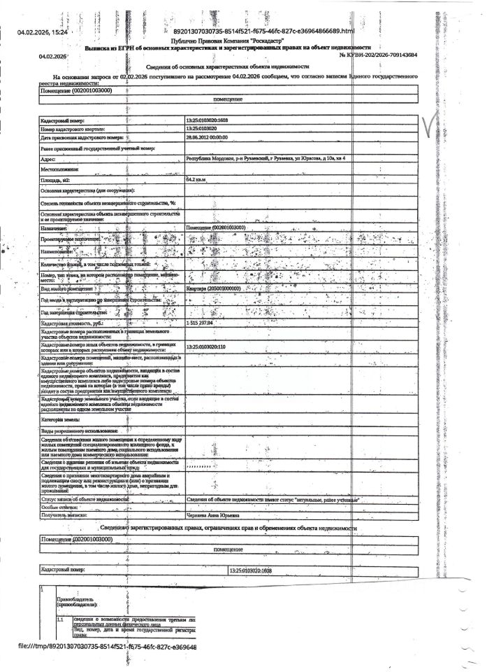 Жилое помещение (квартира) общей площадью 64,2 кв.м., кад. 13:25:0103020:1608, находящееся в пределах объекта недвижимости с кад. 13:25:0103020:110, принадлежащее должнику Репиной О.А. Зарегистрировано два гражданина. Сведениями о фактическом состоянии объекта недвижимости, о задолженности по коммунальным платежам и взносам на капитальный ремонт, организатор торгов не располагает. Техническая документация на объект недвижимости и его фотографии отсутствуют у организатора торгов.