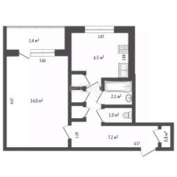 Общая площадь 32,7 кв. м, из которых 14 кв. м — жилая, кухня 6,5 кв. м.