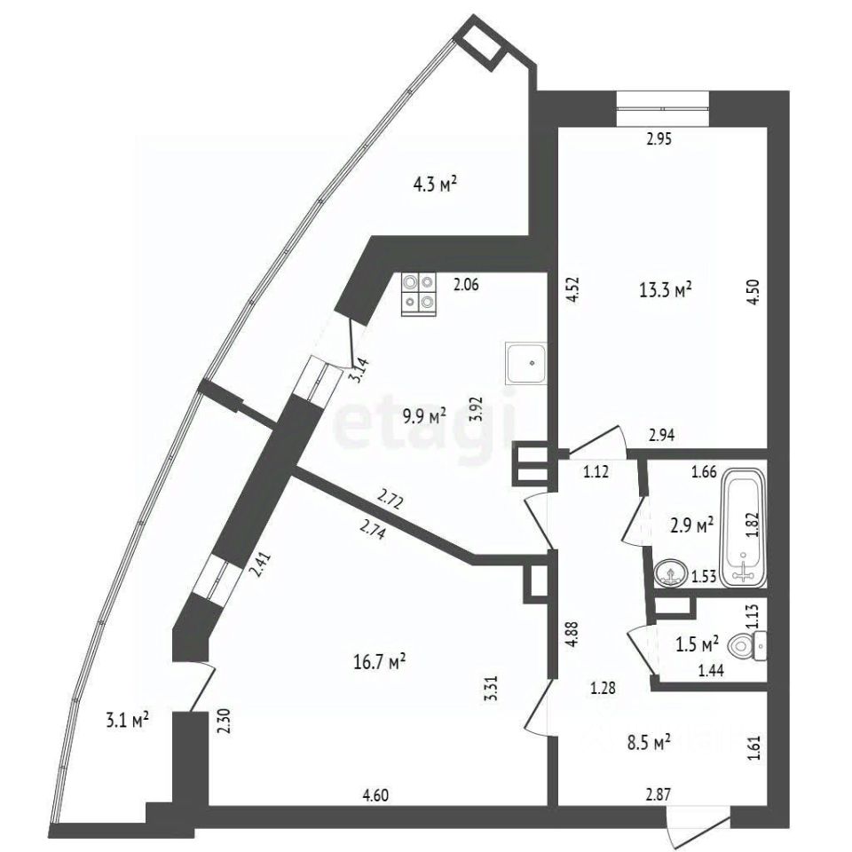Квартира включает две светлые и уютные комнаты площадью 16,7 кв. м. и 13,3 кв. м., из одной из которых вы сможете выйти на застекленный балкон площадью 3,1 кв. м.