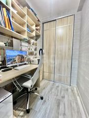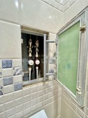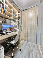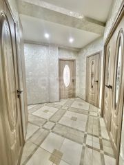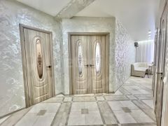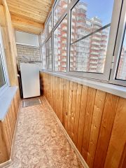 Особое внимание стоит обратить на вместительную гардеробную площадью 5 кв. м, переоборудованную в отдельный рабочий кабинет. Высокие потолки создают ощущение простора и легкости. Установлены пластиковые окна, балкон также застеклен пластиковой рамой. На полу — линолеум, стоит хорошая входная дверь. По желанию в квартире можно сделать ремонт на свой вкус.