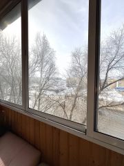 • Балкон обшит вагонкой, установлен стеклопакет;