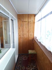 - большая застекленная лоджия, отделанная деревянной вагонкой со встроенными шкафами.