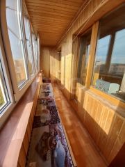 застеклённая лоджия обшита деревом — отличное место для отдыха;