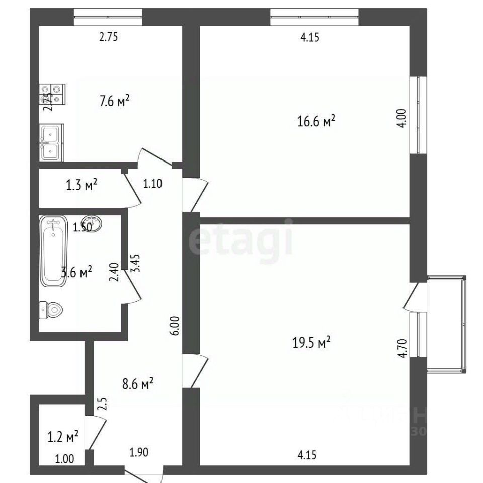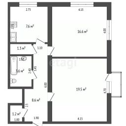 Площадь квартиры составляет 58,4 кв. м, включает 2 изолированные комнаты 16,6 и 19,5 кв. м, кухню 7,6 кв. м, раздельный санузел, а также кладовую для хранения.