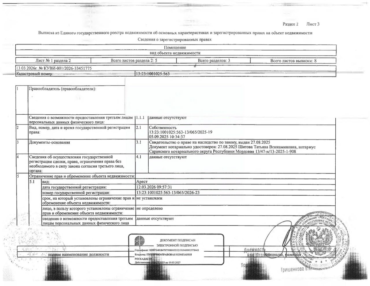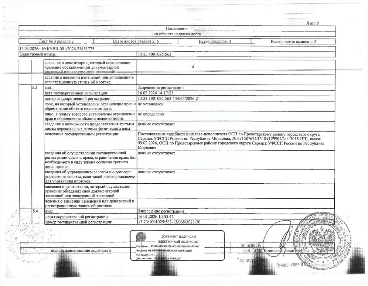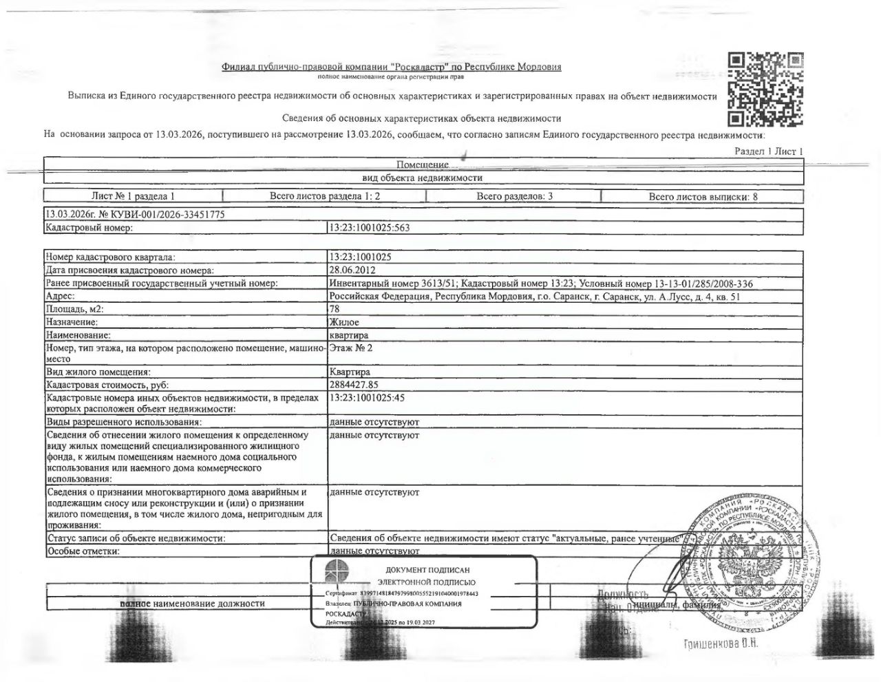 Жилое помещение (квартира) общей площадью 78 кв.м., кад. 13:23:1001025:563, находящееся в пределах объекта недвижимости с кад. 13:23:1001025:45, принадлежащее должнику Сафроненковой Е.С. По месту нахождения объекта недвижимости зарегистрирован один гражданин. Сведениями о фактическом состоянии объекта недвижимости, о задолженности по коммунальным платежам и взносам на капитальный ремонт организатор торгов не располагает. Техническая документация на объект недвижимости и его фотографии отсутствуют у организатора торгов