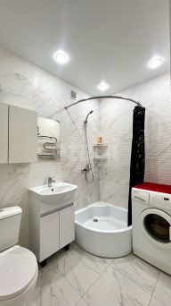 Потолок натяжной со встроенными светильниками, в санузле кафель, на полу керамогранит и дорогой ламинат.