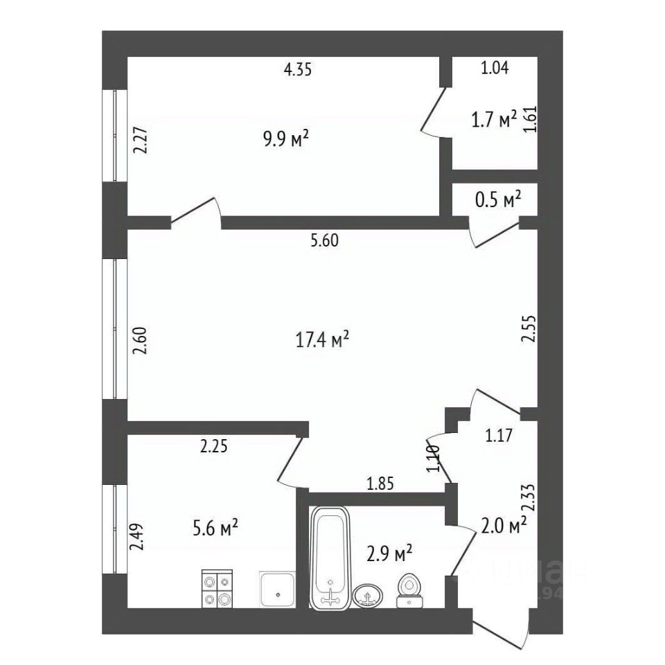 - общая площадь 40 кв.м; кухня 5.6 кв.м;
