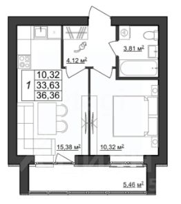 Общая площадь 36,36 кв.м., кухня-гостиная 15,38 кв.м.,