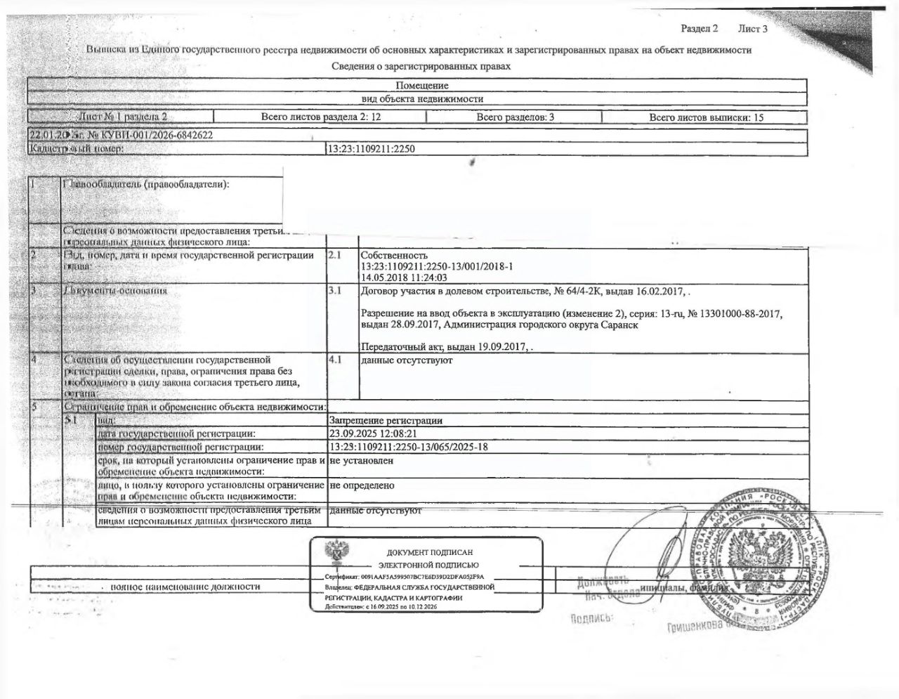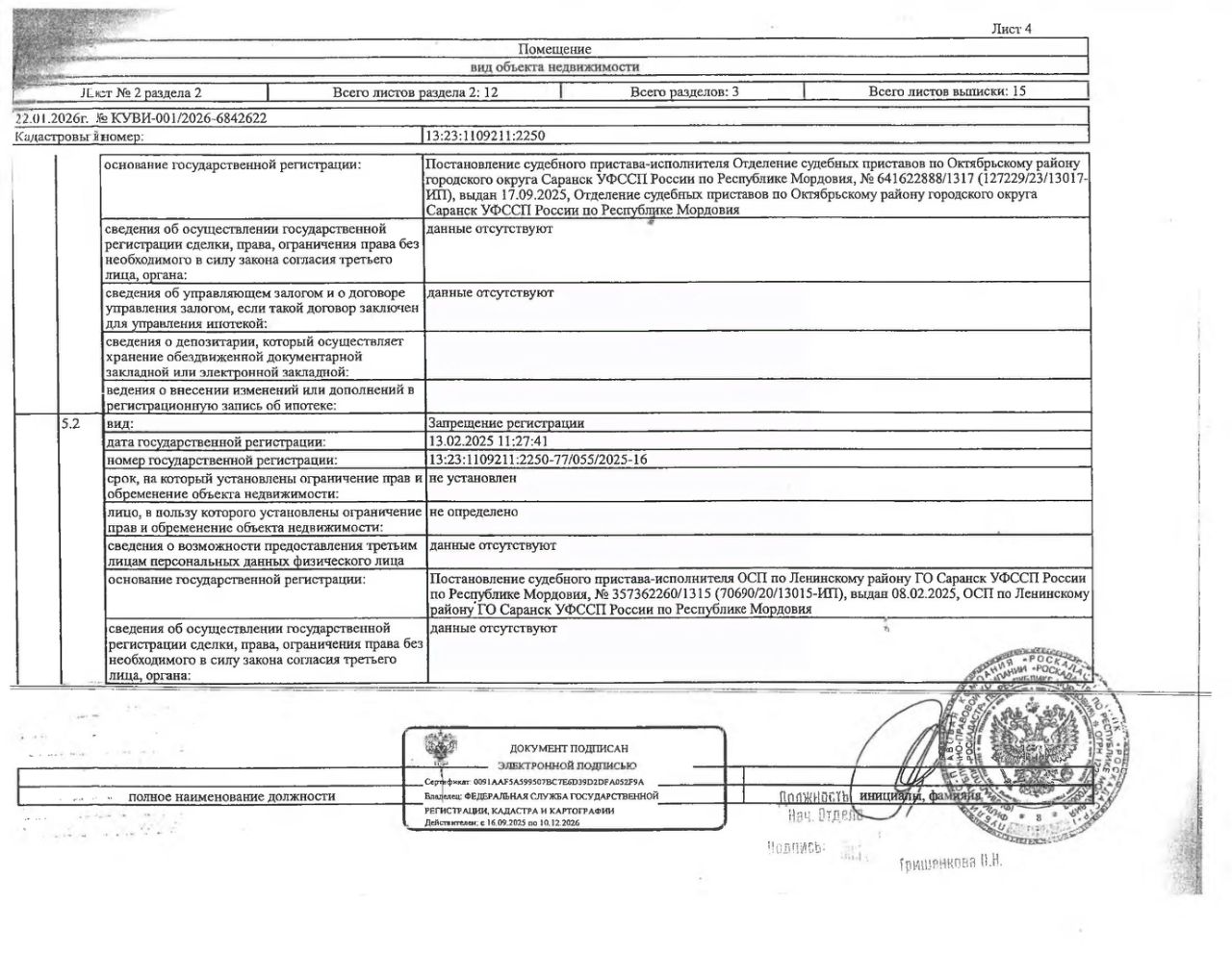 Жилое помещение (квартира) общей площадью 41 кв.м., кад. 13:23:1109211:2250, находящаяся в пределах объекта недвижимости с кад. 13:23:1109211:2194, зарегистрированное за Алямкиным Д.П., правопреемником которого и должником по исполнительному производству является Администрация го Саранск. Зарегистрированные лица отсутствуют. Сведениями о фактическом состоянии объекта недвижимости, о задолженности по коммунальным платежам и взносам на капитальный ремонт организатор торгов не располагает. Техническая документация на объект недвижимости и его фотографии отсутствуют у организатора торгов.