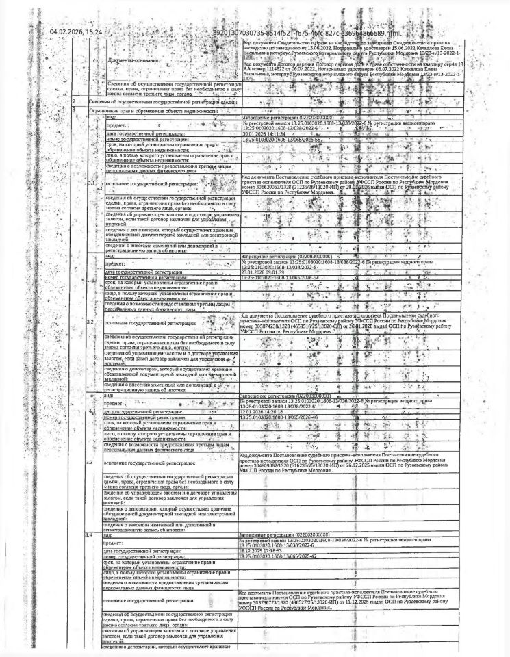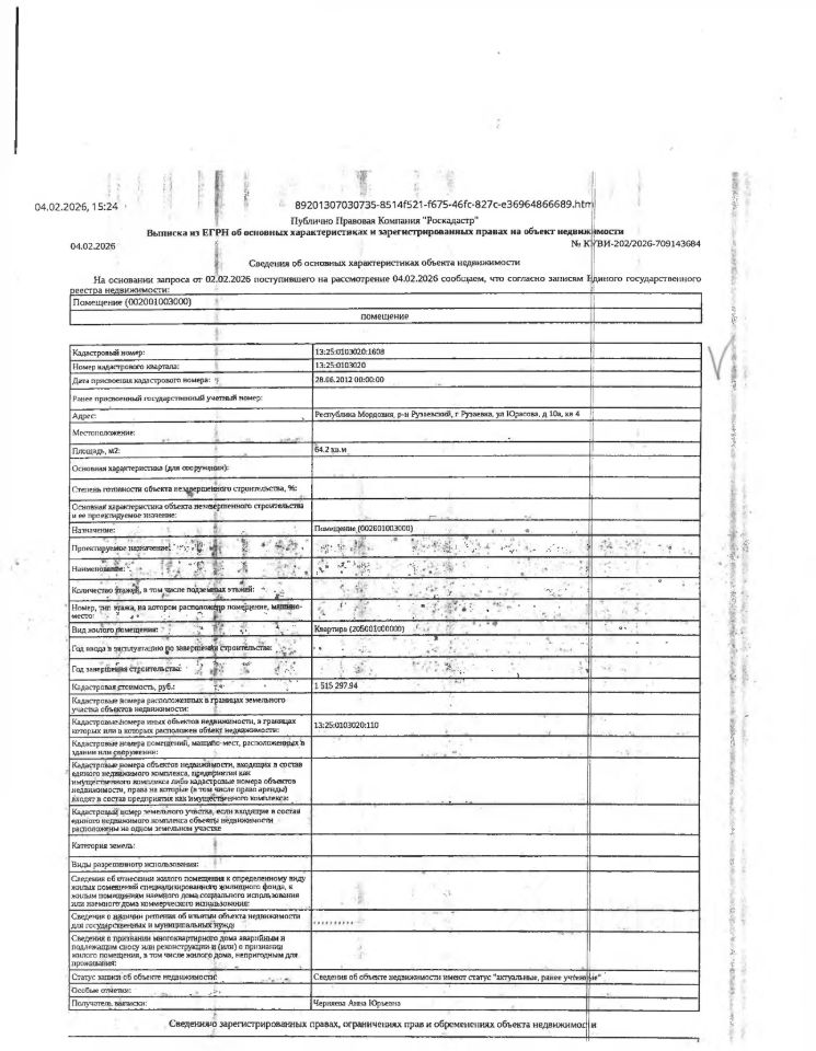 Жилое помещение (квартира) общей площадью 64,2 кв.м., кад. 13:25:0103020:1608, находящееся в пределах объекта недвижимости с кад. 13:25:0103020:110, принадлежащее должнику Репиной О.А. Зарегистрировано два гражданина. Сведениями о фактическом состоянии объекта недвижимости, о задолженности по коммунальным платежам и взносам на капитальный ремонт, организатор торгов не располагает. Техническая документация на объект недвижимости и его фотографии отсутствуют у организатора торгов.