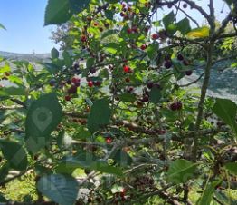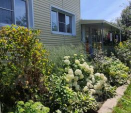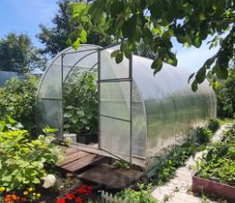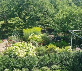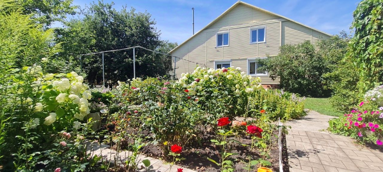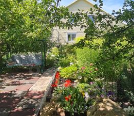 Весь участок засажен фруктовыми деревьями (яблони, груши, вишни, сливы), кустами (красная и чёрная смородина, крыжовник, малина), многолетними цветами (розы, гортензии, пионы и др.), растёт клубника.