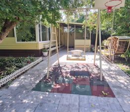 - Мангальная зона под навесом. В мангальной зоне расположены мангал, печь под казан, большой стол, раковина с подведенной водой. Рядом с мангальной зоной место для кострища на покрытой плиткой площадке.