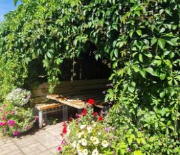 - Летняя беседка с большим столом и скамейками под естественным навесом (виноградная лоза).