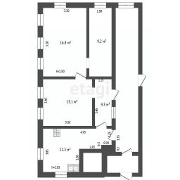 В доме имеется прихожая (4,3 кв. м), кухня (11,3 кв. м) и три комнаты (13,1 кв.м, 16,8 кв.м и 9,2 кв.м), что позволяет разместить семью или использовать одну из комнат как кабинет.