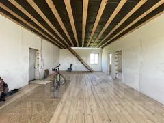 - Первый этаж: выровненные стены, готовый пол, обшитый потолок, зонирование несущей стеной.