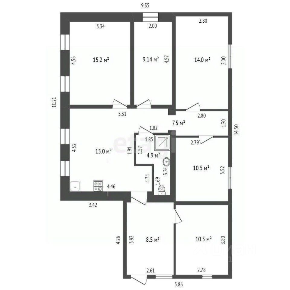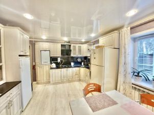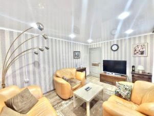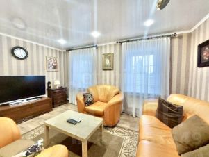 В доме сделан современный ремонт. Площадь дома — 103,7 кв. м. Холл — 8,5 кв. м. Кладовка (находится погреб) — 10,5 кв. м. Кухня — 15 кв. м. Гостинная — 15,2 кв. м. Спальня (детская) — 9 кв. м. Спальня 2 — 14 кв. м. Спальня 3 — 10,5 кв. м. Санузел (совмещенный) — 5 кв. м. Коридор — 10 кв. м. Входная дверь металлическая. Окна пластиковые. Пол (кухня) — кварцвинил, остальные комнаты — качественный современный линолеум. Потолки — натяжные с встроенными точечными светильниками. Современные радиаторы отопления. Современные межкомнатные двери. Новая электрика (проводка, автоматы и т. д.). Санузел совмещен, отделан панелями.