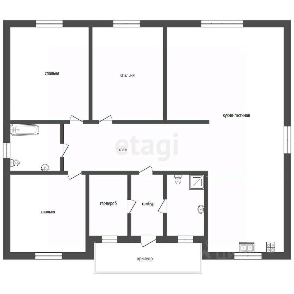 В доме очень удобная планировка, три изолированные комнаты по 16 кв. м и просторная кухня-гостиная площадью 40 кв. м с выходом на веранду.