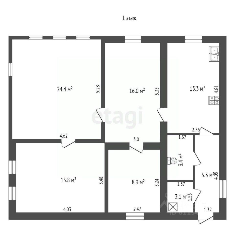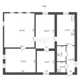 Общая площадь равна 150 м², 4 комнаты на первом этаже с новым ремонтом: первая 8,9 м², вторая 15,8 м², третья 24,4 м², четвёртая 16 м², кухня 13,3 м². И 2 комнаты на втором с черновой отделкой.